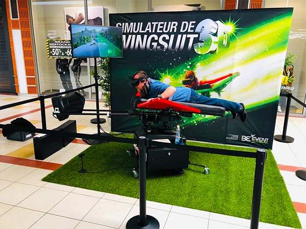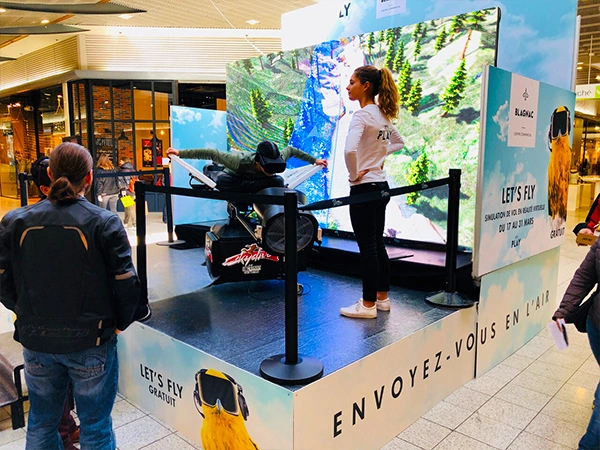 Axé sur les nouvelles technologies, le simulateur de wingsuit en réalité virtuelle s’implante parfaitement dans le décor d’un centre commercial.
